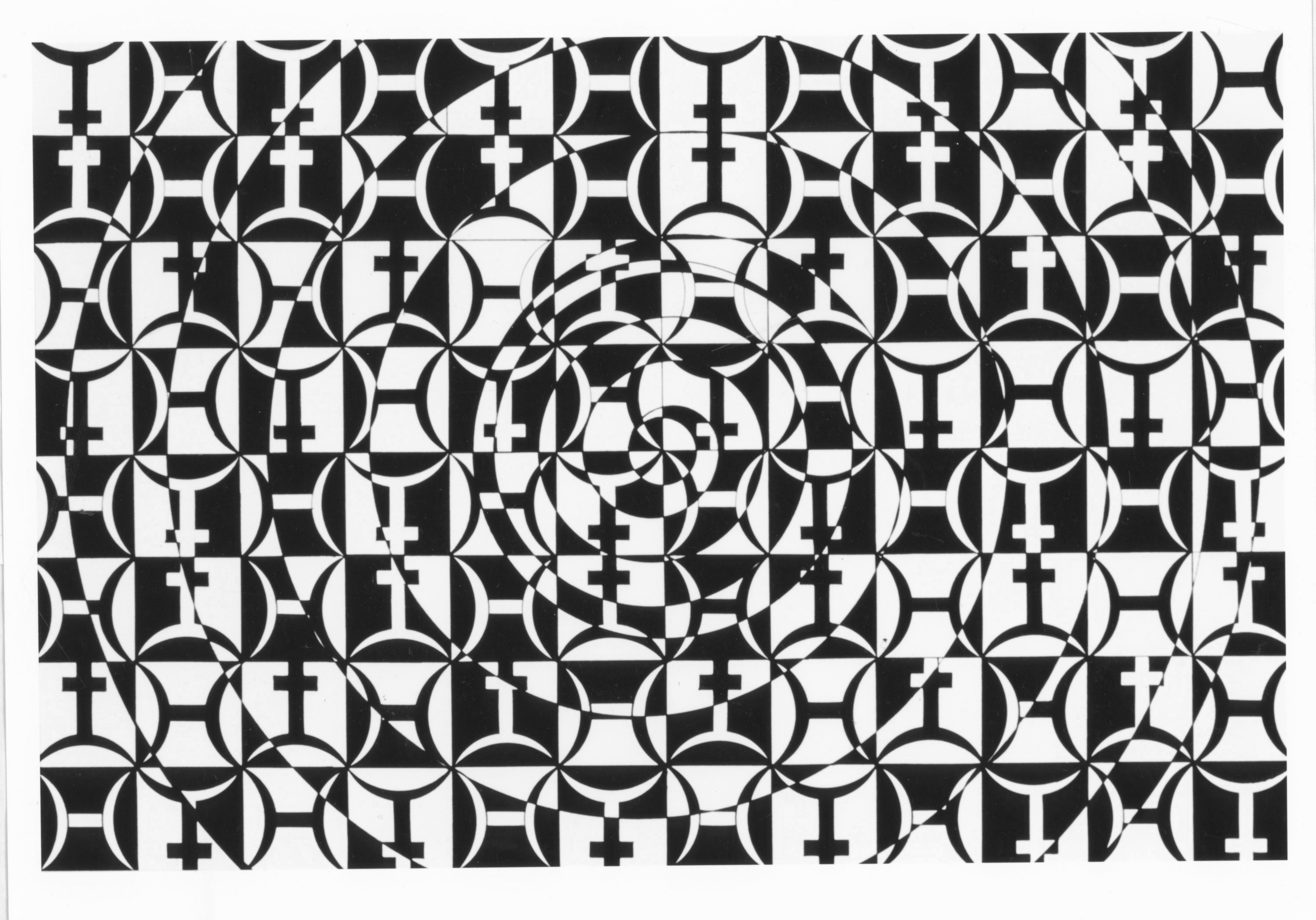 Two images also by Amy Ione and Christopher Tyler. One, on the left, is a black and white ink painting (on paper) that uses the astrological symbol for Pisces. The other is a Matrix algebra version that was computed in MatLab by Christopher W. Tyler